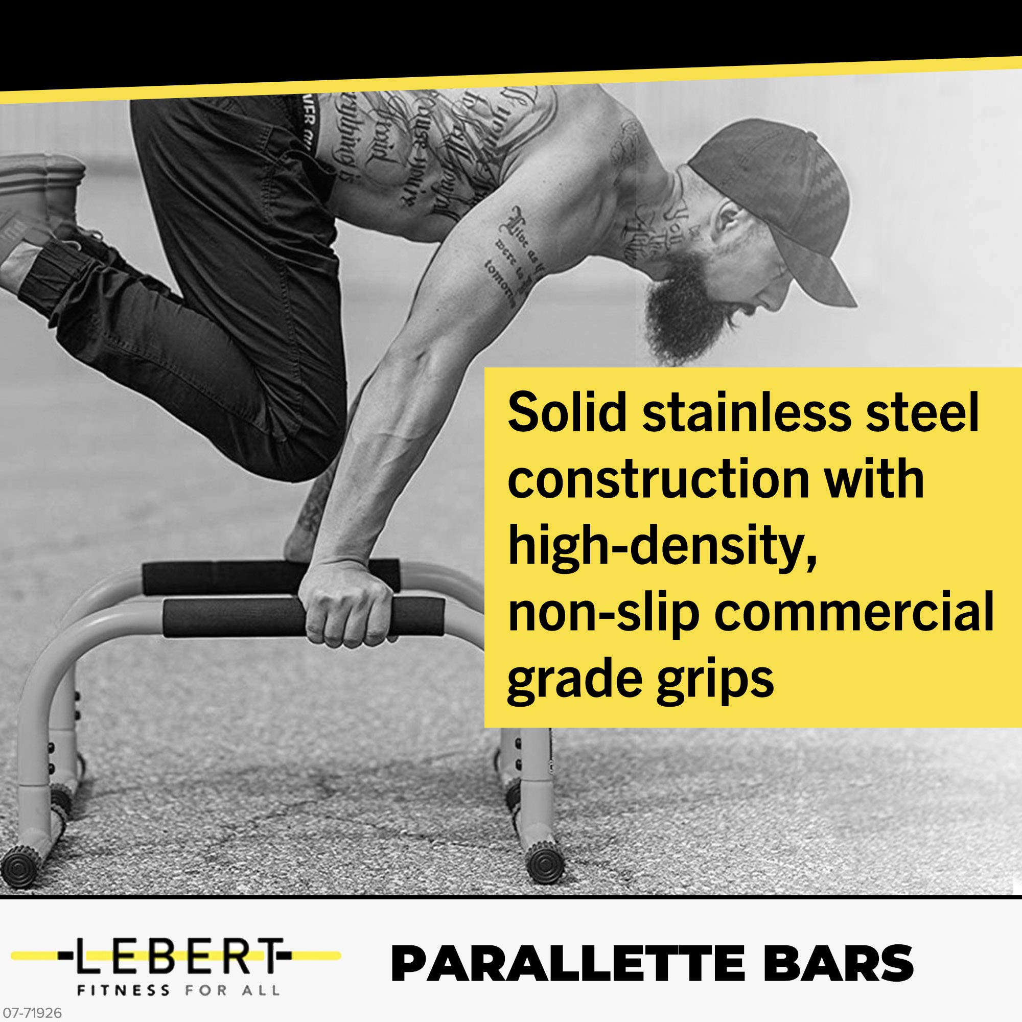 - PARALLETTE BARS: Solid stainless steel construction with high density, non slip commercial grade grips
