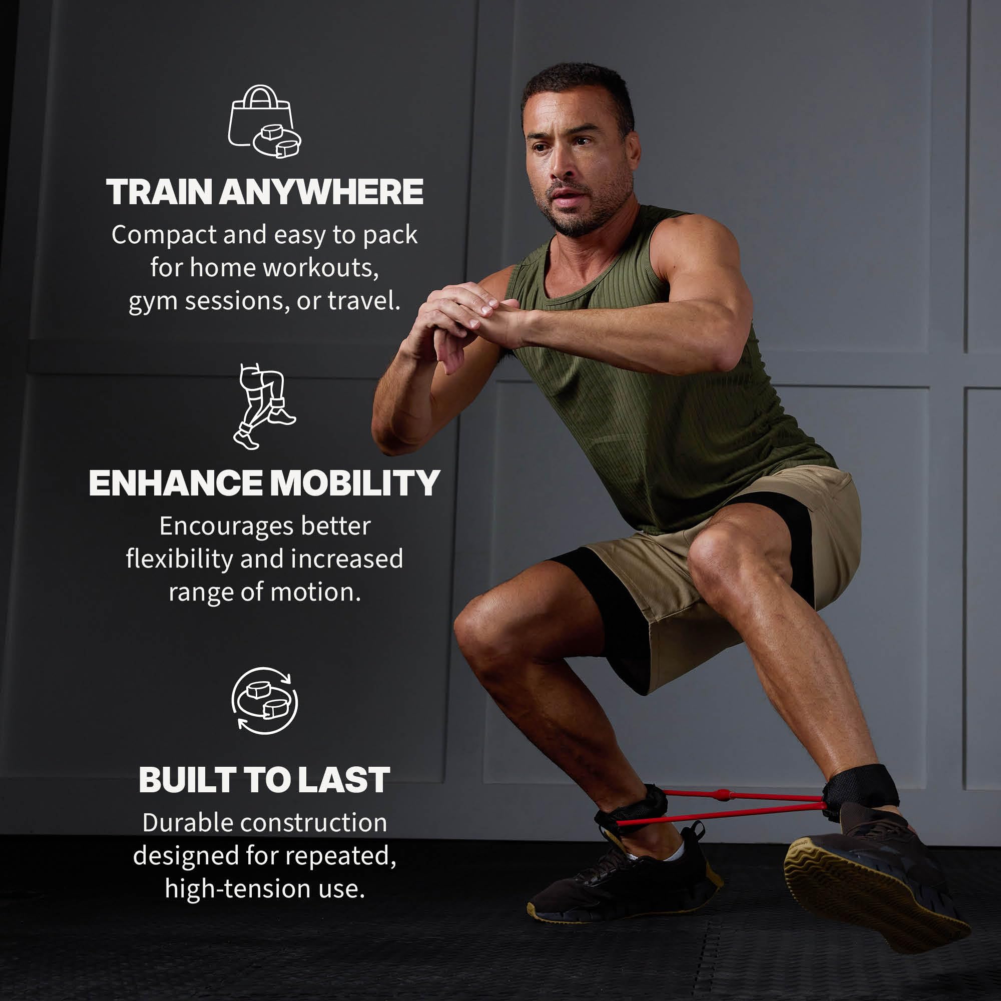 - Xercuff Leg Resistance Band - Our ankle bands for working out are the perfect tool to help strengthen, condition, and firm core muscles of the lower body (buttocks, hips, and thighs).